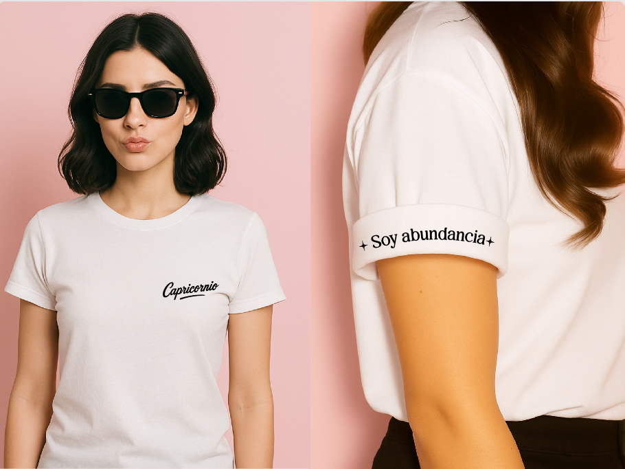 Cada playera tiene un bordado minimalista con el nombre de tu signo al frente, y en la manga un mantra personalizado que refleja tu característica más poderosa: tu fuego, tu calma, tu intuición, tu disciplina…