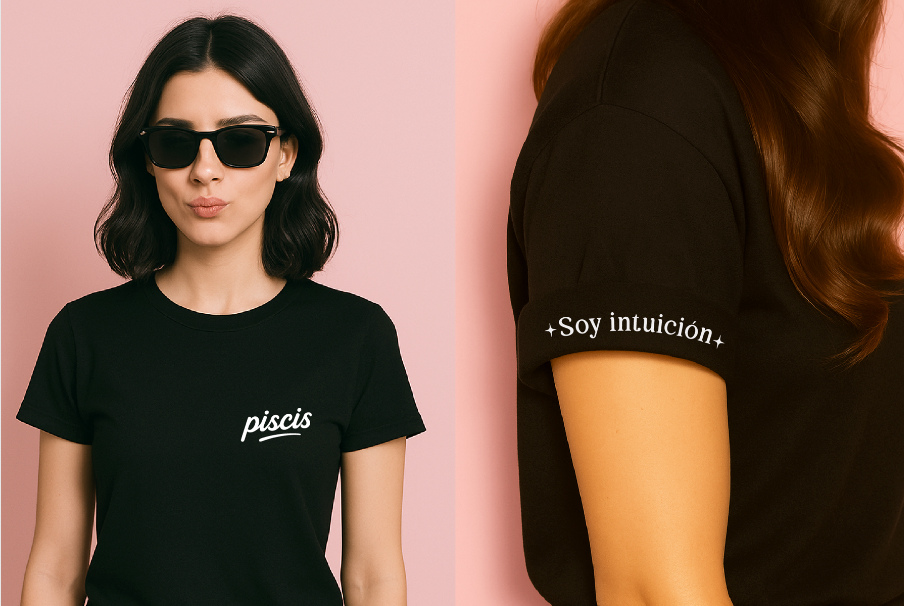 Cada playera tiene un bordado minimalista con el nombre de tu signo al frente, y en la manga un mantra personalizado que refleja tu característica más poderosa: tu fuego, tu calma, tu intuición, tu disciplina…