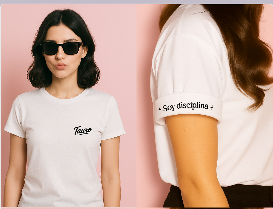 Cada playera tiene un bordado minimalista con el nombre de tu signo al frente, y en la manga un mantra personalizado que refleja tu característica más poderosa: tu fuego, tu calma, tu intuición, tu disciplina…